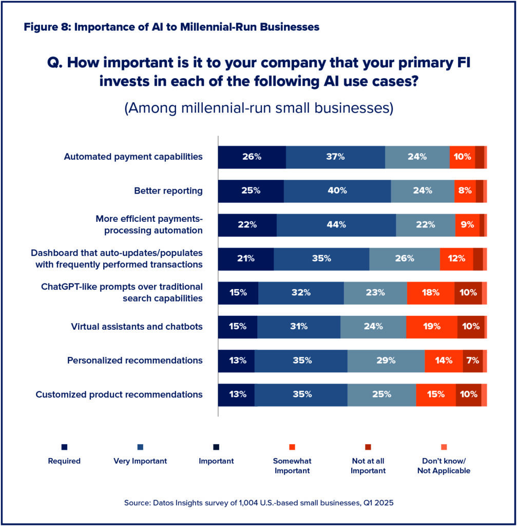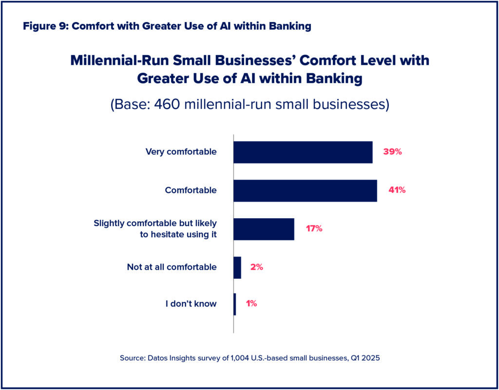 New research from leading analyst firm Datos Insights digs into the opportunity to win market share among millennial businesses. According to the survey, 80% of millennial-run small businesses feel comfortable or very comfortable integrating more AI into their banking relationships. For banks and credit unions, staying ahead of these trends isn’t just smart, it’s essential for building long-term loyalty and growth.