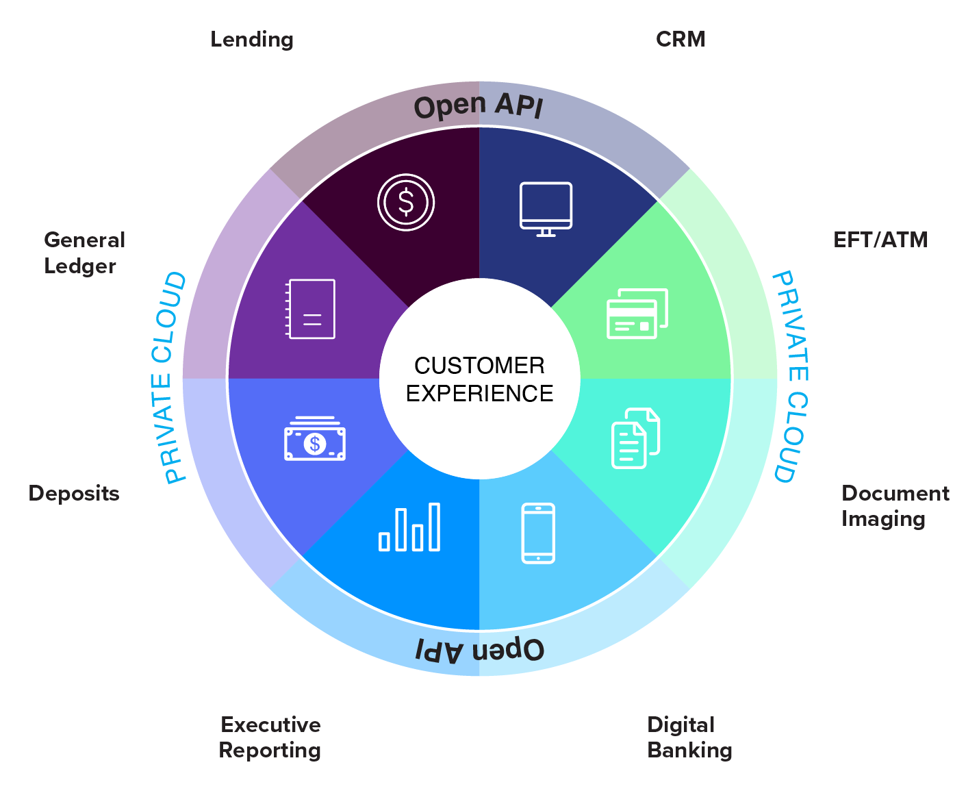 At its core, our enterprise banking model prioritizes the end user experience, because that is where new business is won and lost in today’s banking environment. Each segment of our enterprise banking solutions integrates directly into NuPoint, with the ability to connect third-party APIs.