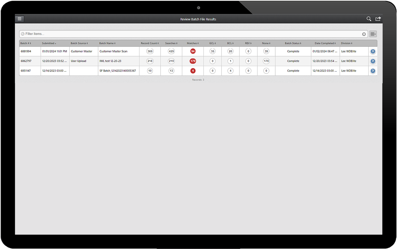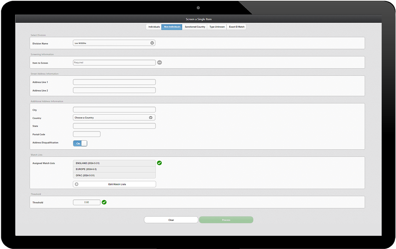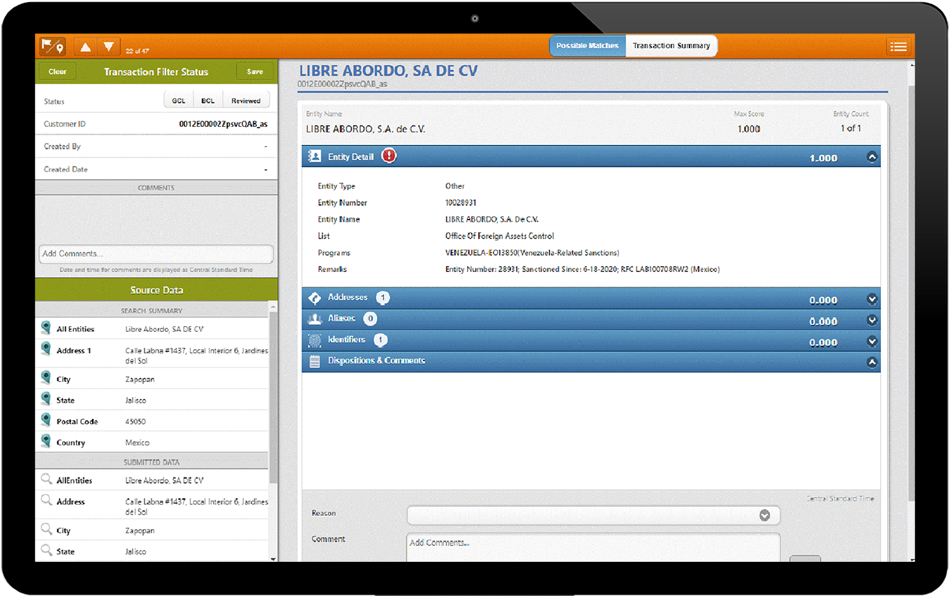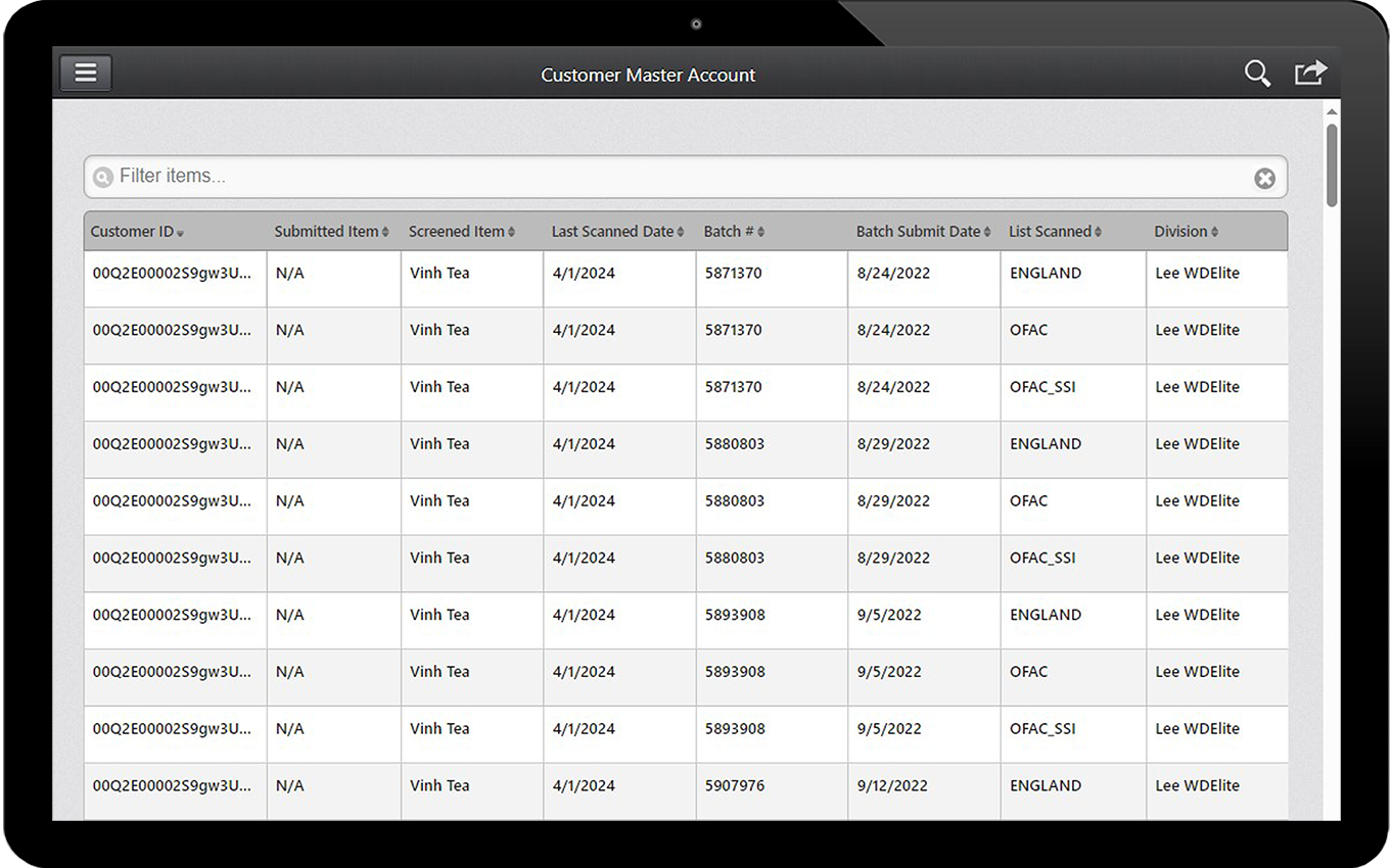 • Maintain a master list of customers, vendors and business partners and their screening history.