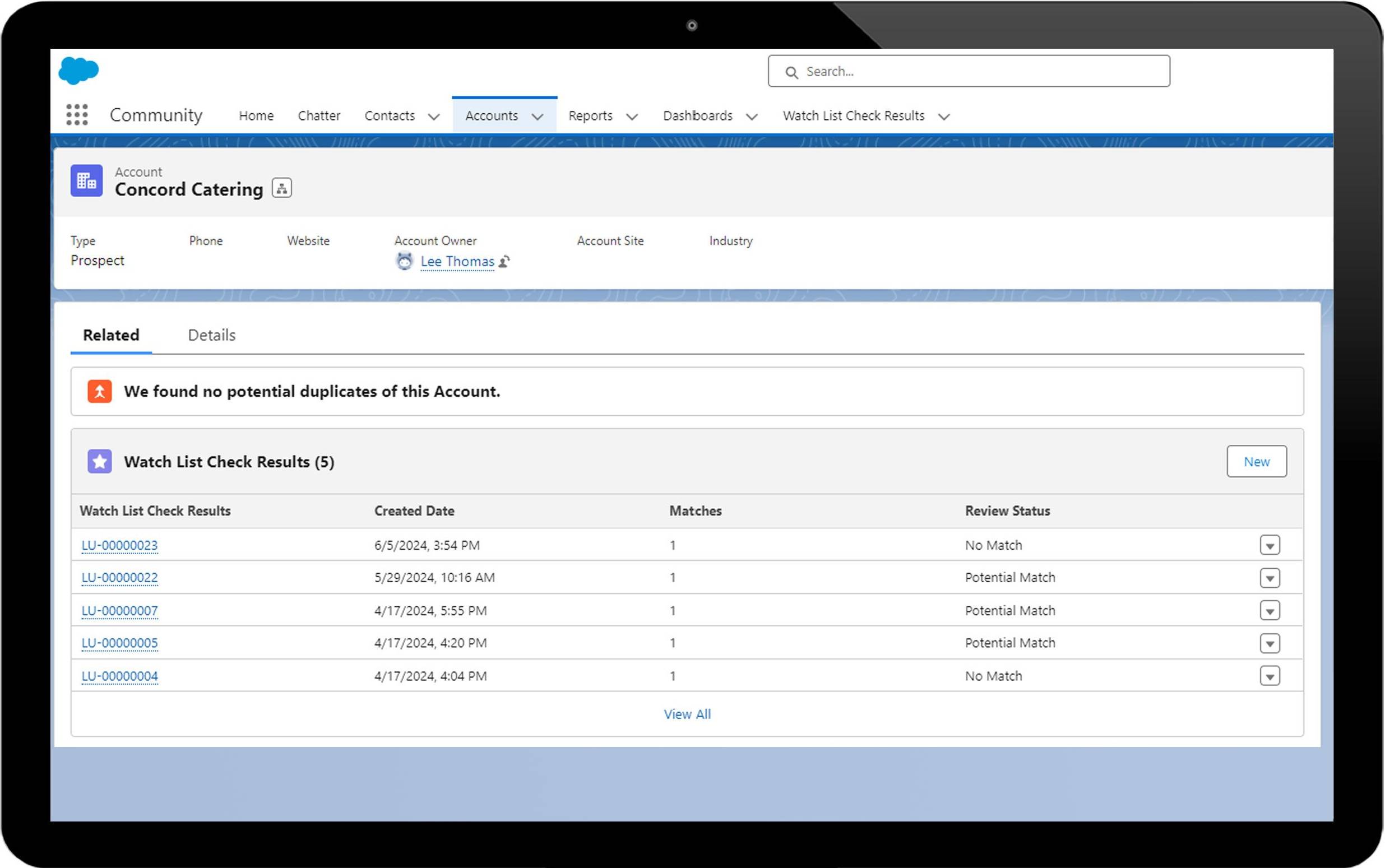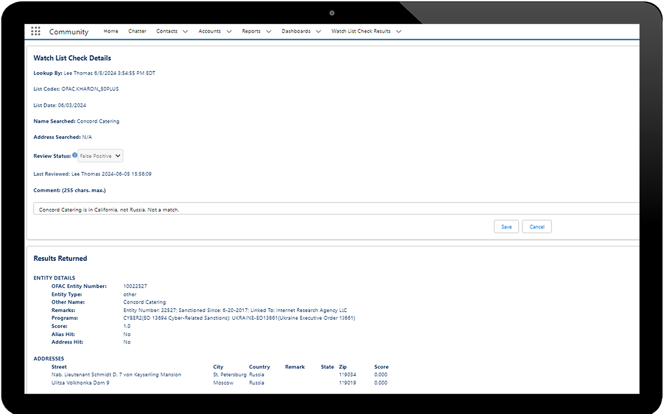 • Scan accounts, contacts, leads and opportunities against watch lists provided by CSI via API or batch.