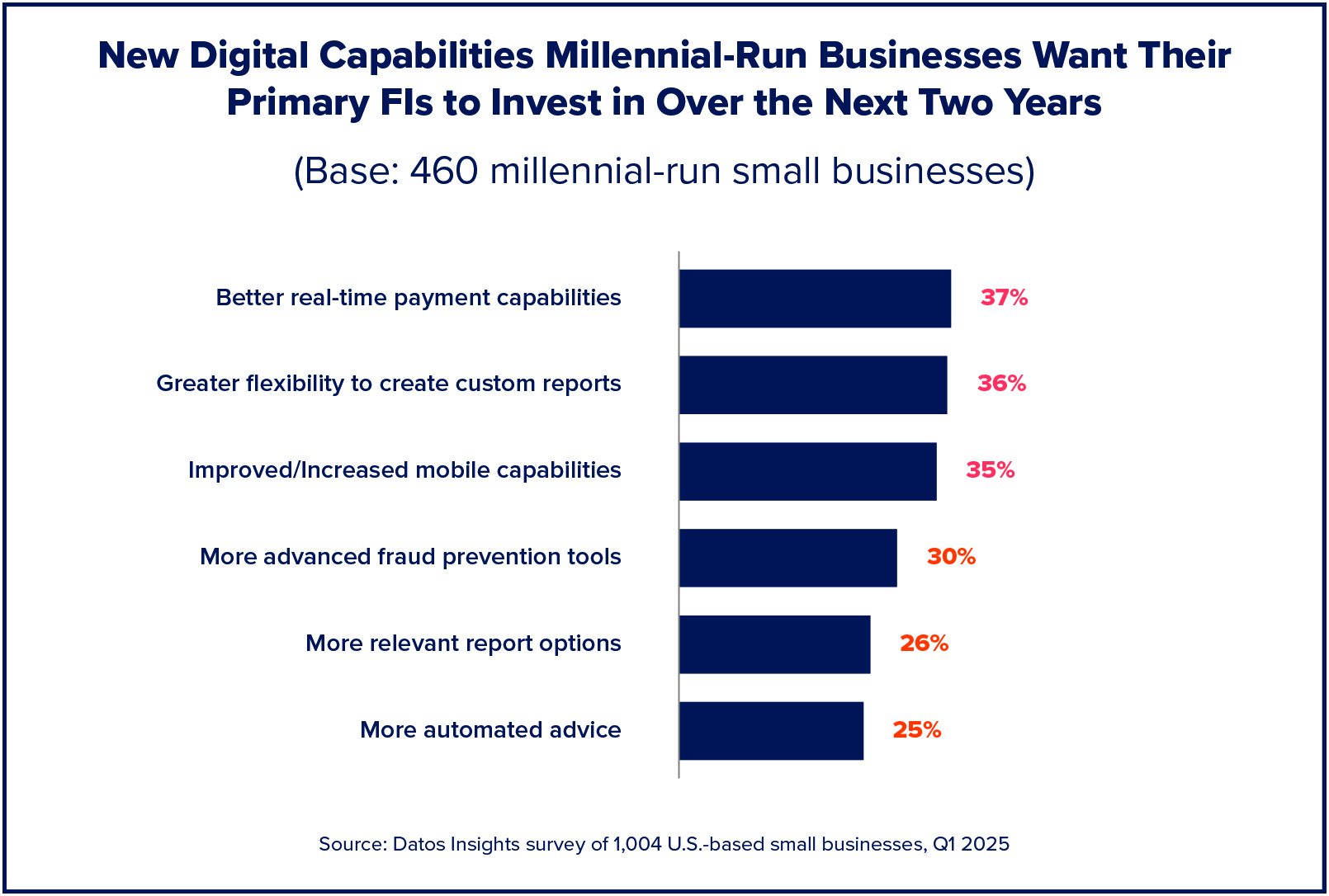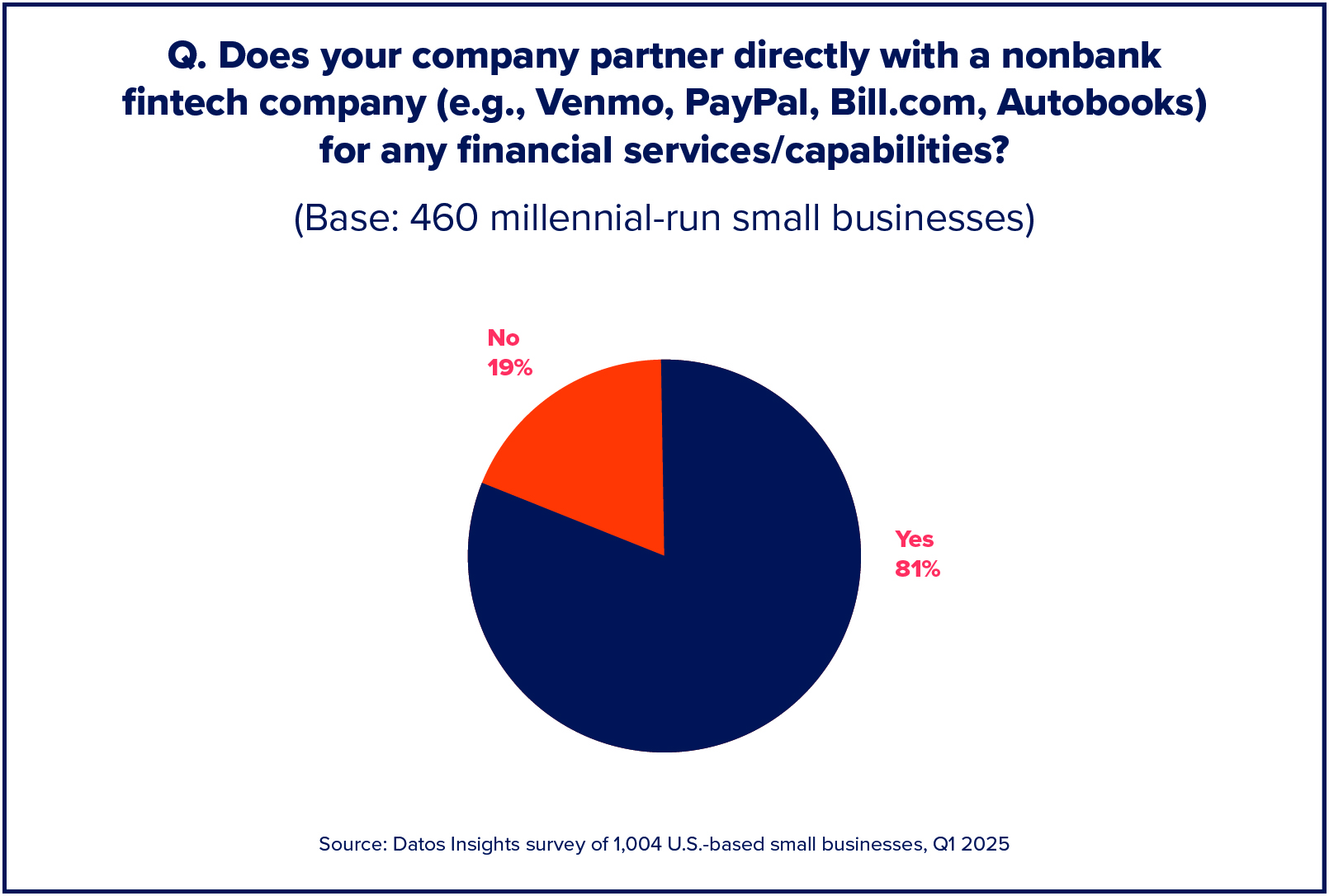Many community banks and credit unions are not moving fast enough to provide the financial tools businesses need, according to Datos Insights. In fact, 81% of millennial-run businesses indicated they are partnering directly with nonbank fintech companies for a number of key financial services, including faster payments, payroll, invoicing, and money management tools.